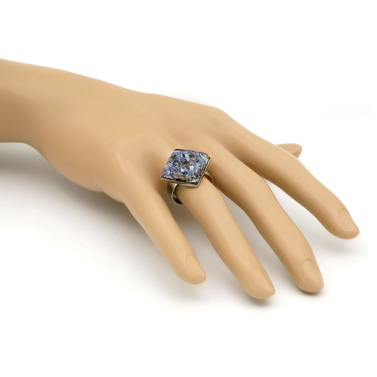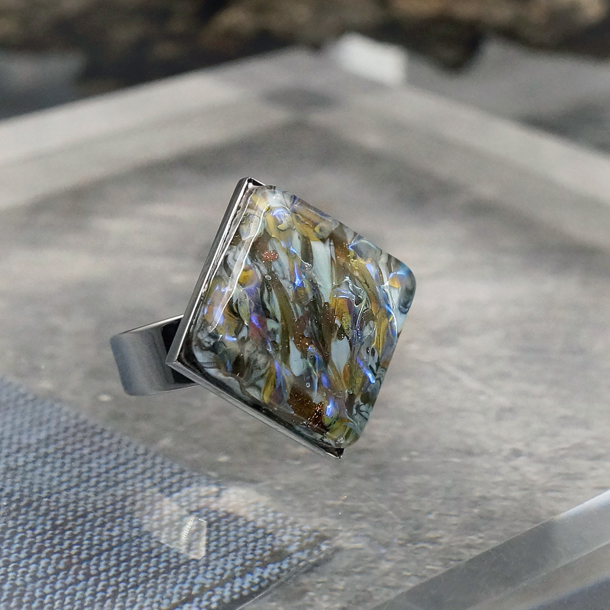 Кольцо изготовлено из муранского стекла и гипоаллергенной ювелирной стали, что очень важно для людей с чувствительной кожей. Металл не темнеет и не подвергается воздействиям окружающей среды, надолго обеспечивая красивый внешний вид изделия. Размер стеклянного элемента - 2,3*2,3 см. Кольцо безразмерное, регулируется с 16 до 19 размера. Вес - 5 гр.