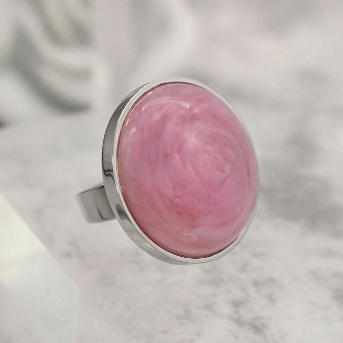 Кольцо изготовлено из муранского стекла и гипоаллергенной ювелирной стали, что очень важно для людей с чувствительной кожей. Металл не темнеет и не подвергается воздействиям окружающей среды, надолго обеспечивая красивый внешний вид изделия. Диаметр стеклянного элемента - 2,5 см. Кольцо безразмерное, регулируется с 16 до 19 размера. Вес - 13 гр.