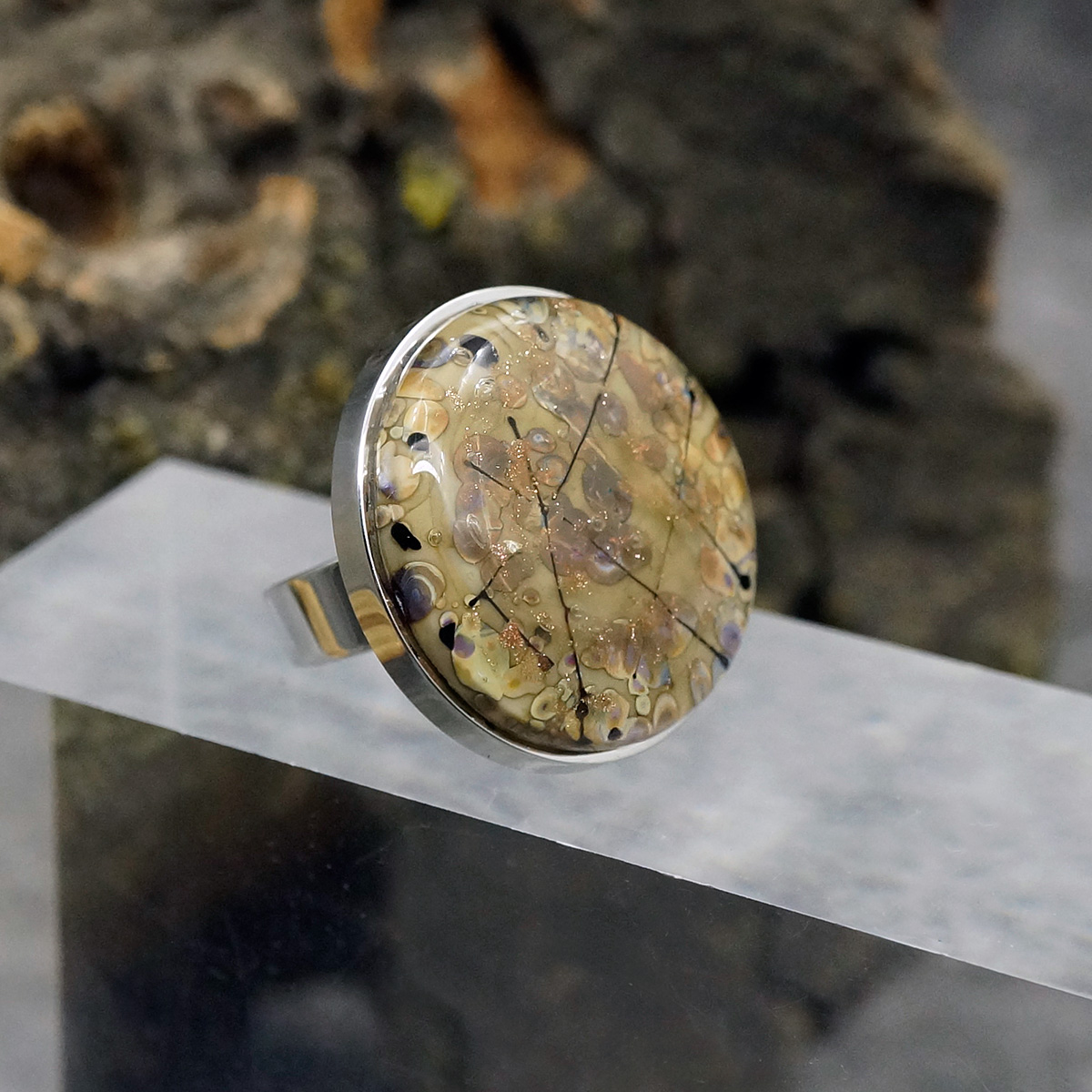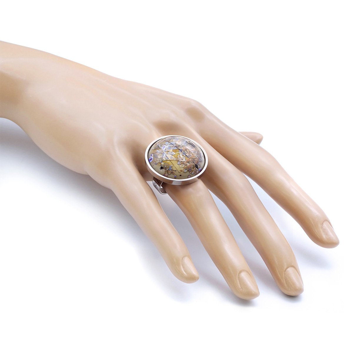 Кольцо изготовлено из муранского стекла и гипоаллергенной ювелирной стали, что очень важно для людей с чувствительной кожей. Металл не темнеет и не подвергается воздействиям окружающей среды, надолго обеспечивая красивый внешний вид изделия. Диаметр стеклянного элемента - 2,5 см. Кольцо безразмерное, регулируется с 16 до 19 размера. Вес - 12 гр.