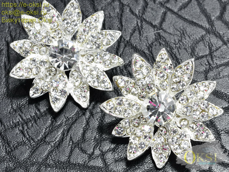 Роскошные, крупные клипсы в форме цветов, инкрустированы сверкающими кристаллами. Качественное родиевое покрытие серебряного цвета. Размер цветка 3 см х 3 см.