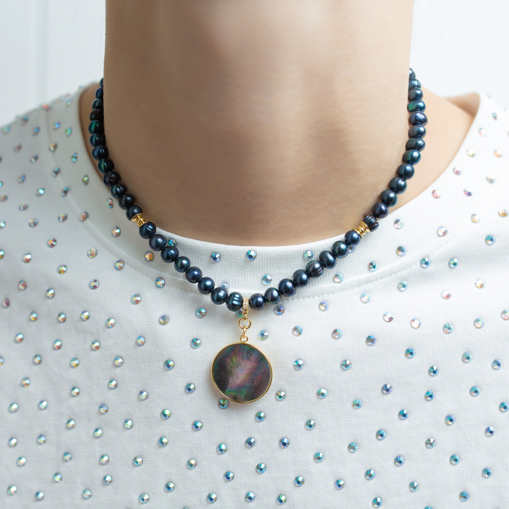 Ювелирный сплав, золочение, натуральный тёмный перламутр, речной чёрный жемчуг, кристаллы.