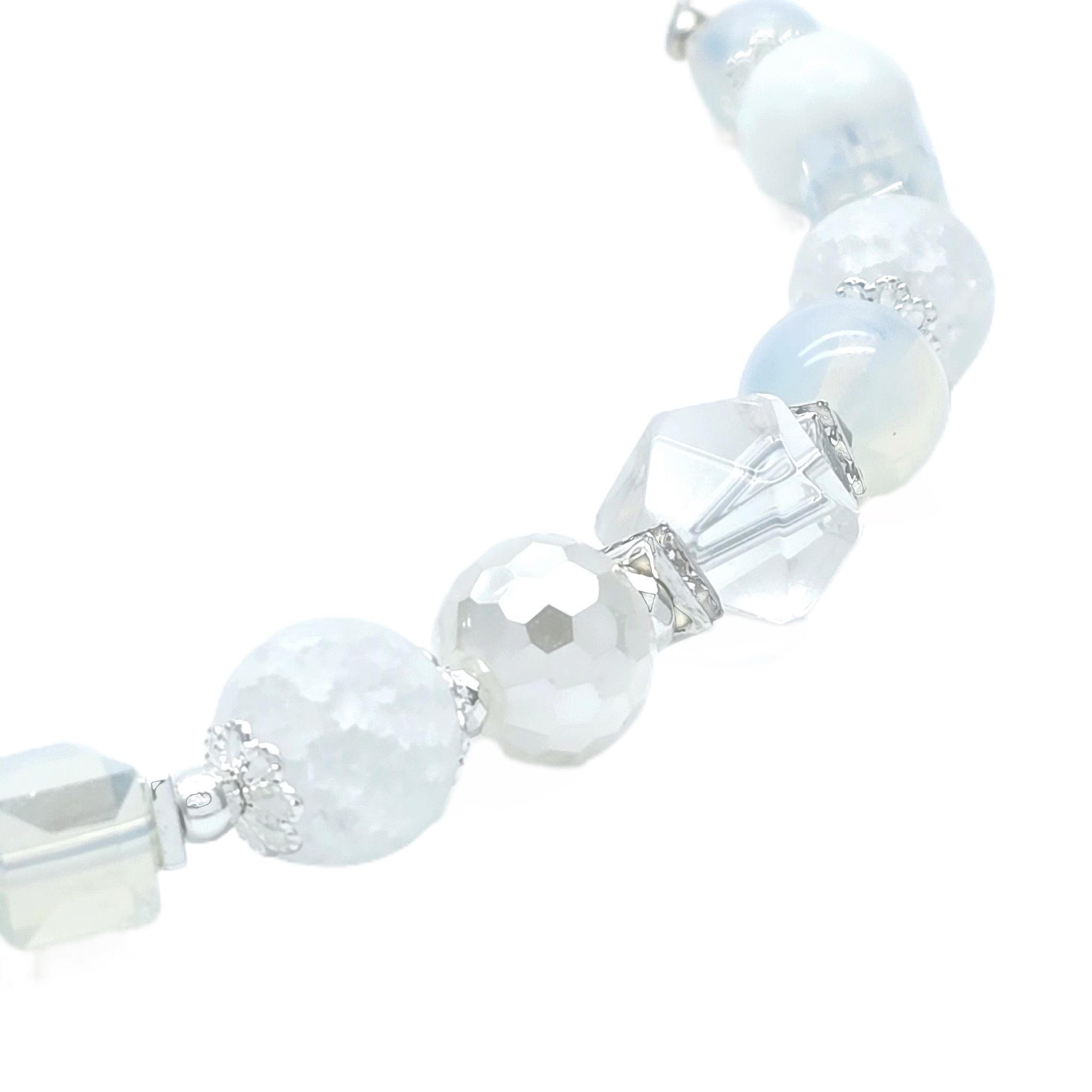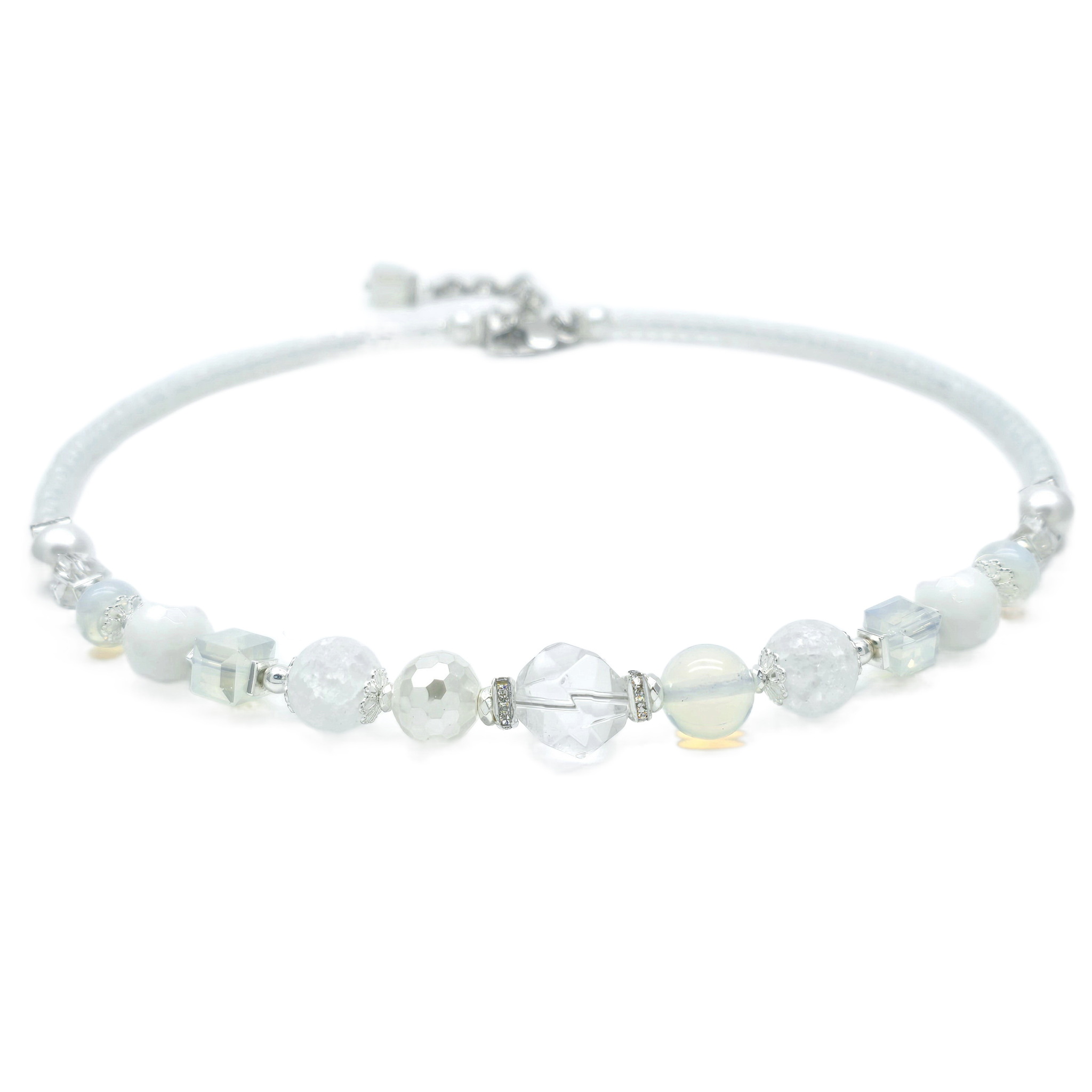 Лунный камень, жемчуг Майорка, хрусталь, агат, кварц, стразы, ювелирный сплав. Гальваническое покрытие: родий.