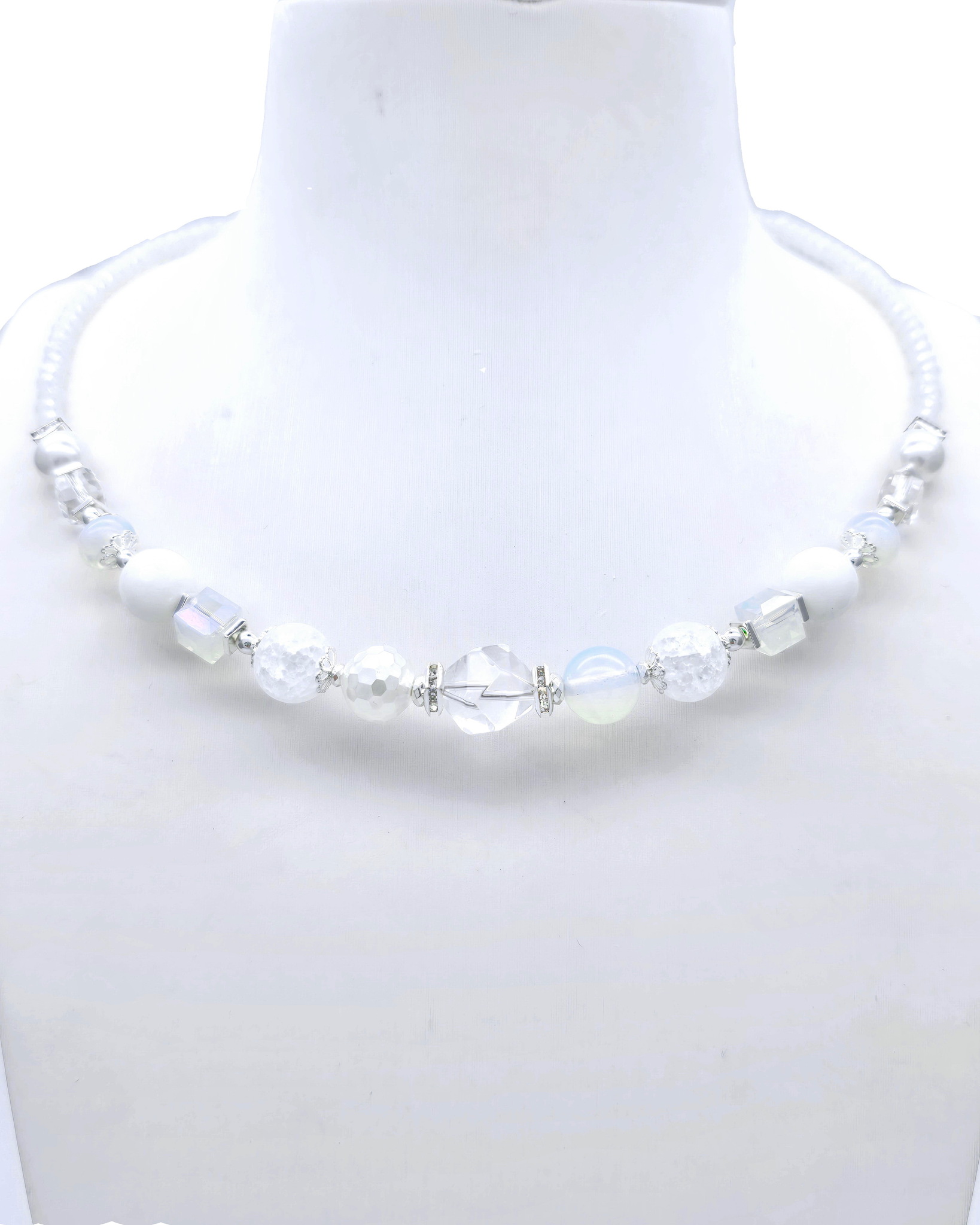 Размер: Длина колье 42+5 см. Лунный камень 3*4 мм, 10 мм, жемчуг Майорка 6;8;10 мм, агат 10 мм, хрусталь 11 мм.