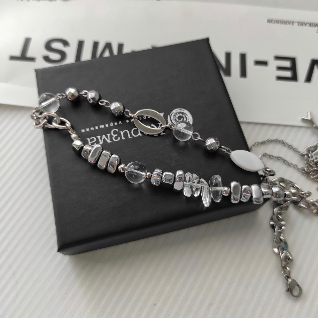 Колье состоит из 3 разных цепочек, которые можно носить вместе, в качестве многослойного колье. Или раздельно - в качестве отдельных цепочек. Или комбинируя их по две в разных вариациях. Также все цепочки соединяются между собой. Получается длинная нить ~150см, которую можно носить по разному: в 2 оборота или как бодичейн. Висюльки в одной из цепей можно носить в расправленном виде или закрученном ( как украшение хомут).