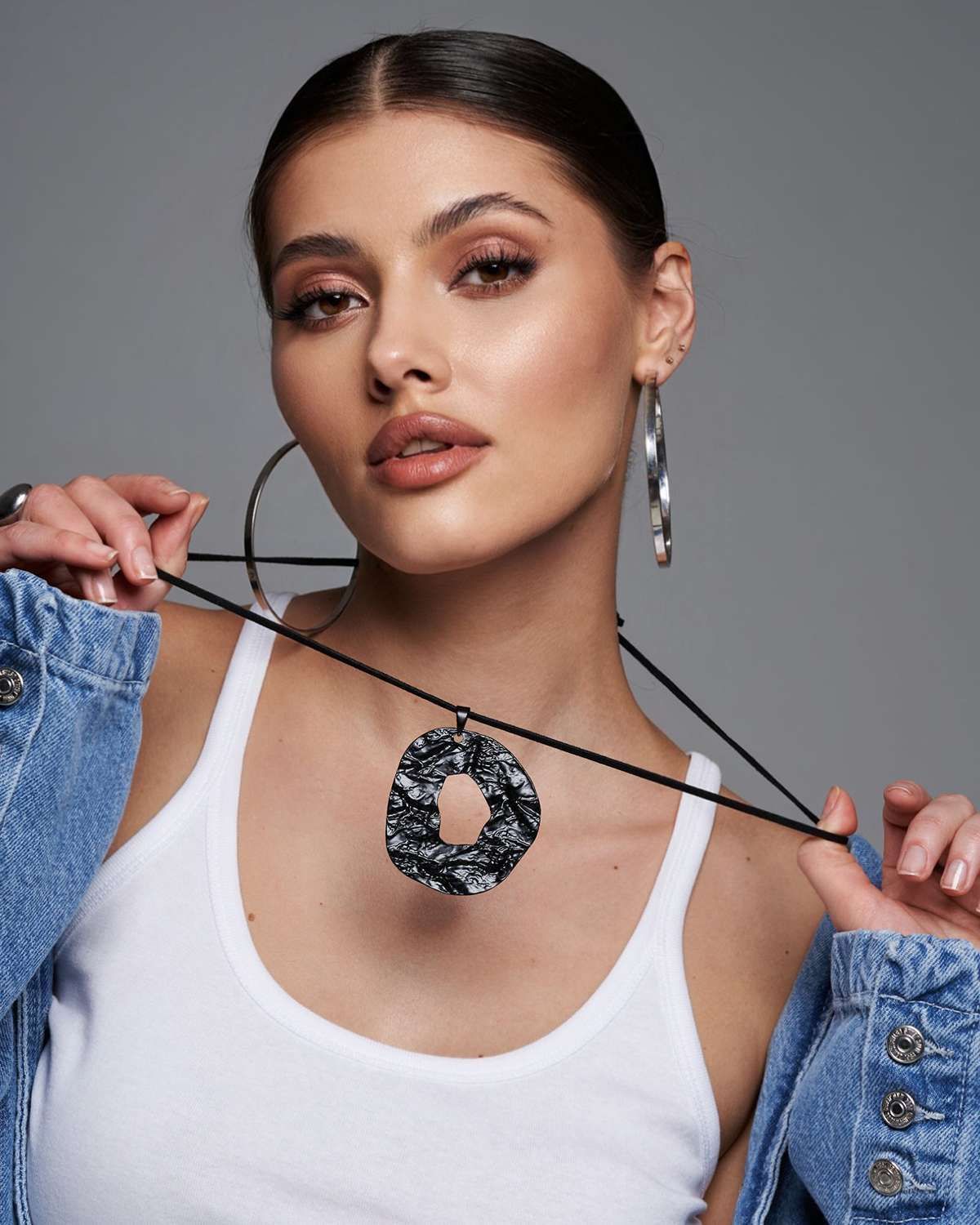 Длина матинэ в 45 см идеально сочетается с замшевым шнурком, обеспечивая комфортную посадку колье на шее. Это колье с крупным кулоном станет замечательным выбором для тех, кто ценит минимализм и оригинальный дизайн. Крупная круглая подвеска привлекает взгляды и придает дерзости, а также отлично смотрится как в повседневном, так и в вечернем образе. Дизайнеры, создававшие украшение, акцентировали внимание на контрасте между глянцевой поверхностью и фактурой подвески, благодаря этому, колье будет великолепно смотреться как в солнечный день, так и при искусственном освещении, добавляя изюминку любому наряду. Бижутерный сплав / Искуственная замша