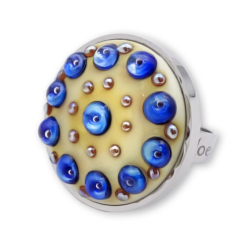 Кольцо изготовлено из муранского стекла и гипоаллергенной ювелирной стали, что очень важно для людей с чувствительной кожей. Металл не темнеет и не подвергается воздействиям окружающей среды, надолго обеспечивая красивый внешний вид изделия. Диаметр стеклянного элемента - 2,5 см. Кольцо безразмерное, регулируется с 16 до 19 размера. Вес - 12 гр.
