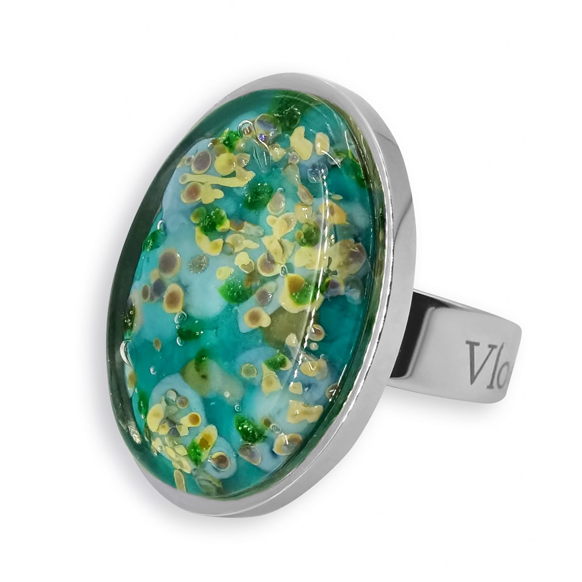 Кольцо изготовлено из муранского стекла и гипоаллергенной ювелирной стали, что очень важно для людей с чувствительной кожей. Металл не темнеет и не подвергается воздействиям окружающей среды, надолго обеспечивая красивый внешний вид изделия. Размер стеклянного элемента - 1,9*2,6 см. Кольцо безразмерное, регулируется с 16 до 19 размера. Вес - 8 гр.