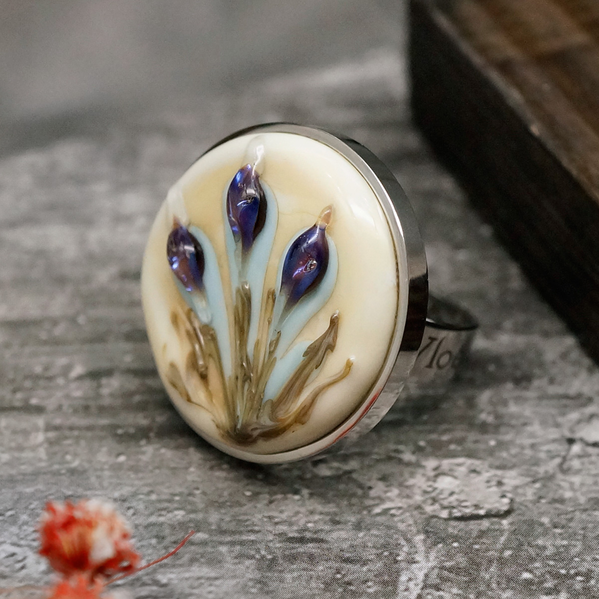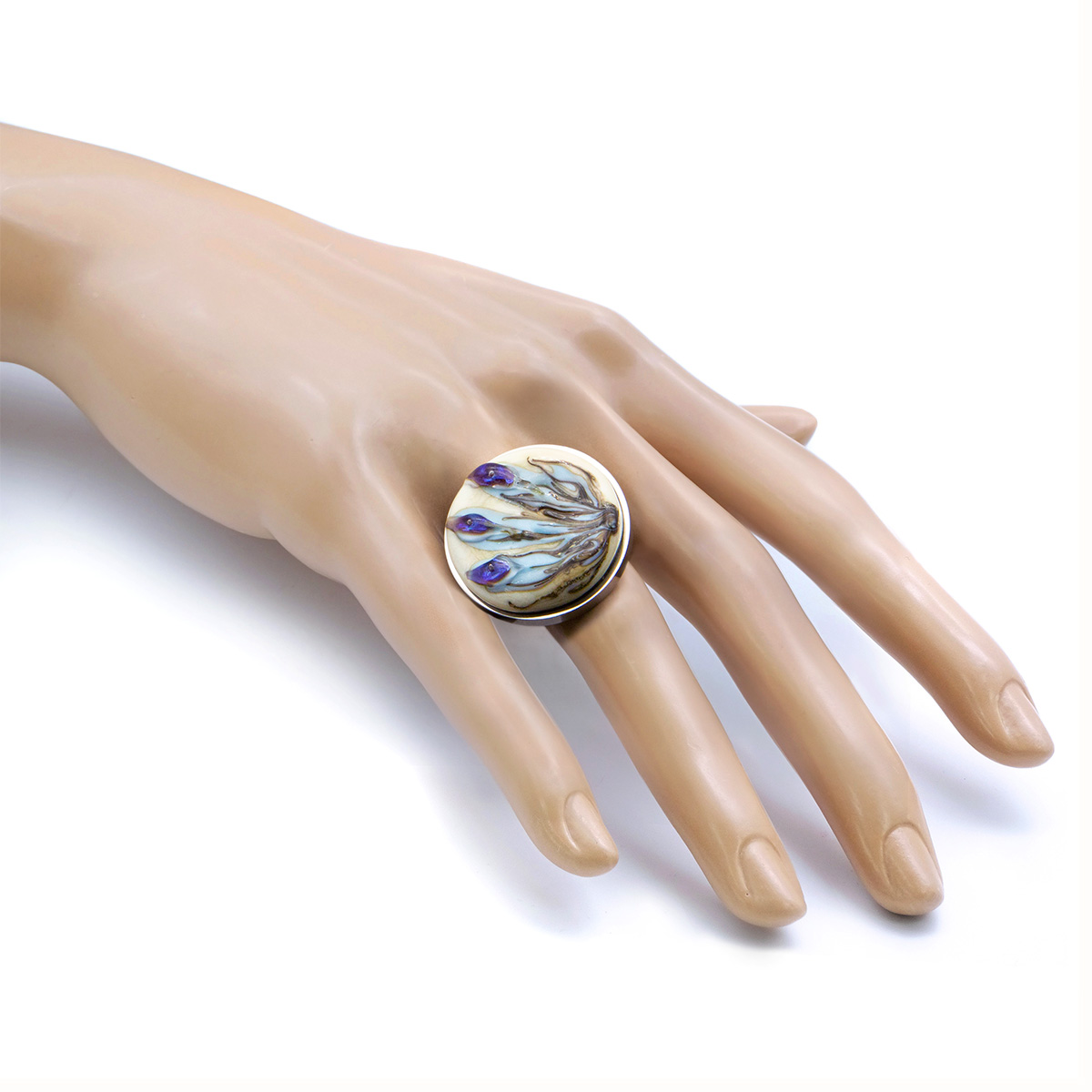 Кольцо изготовлено из муранского стекла и гипоаллергенной ювелирной стали, что очень важно для людей с чувствительной кожей. Металл не темнеет и не подвергается воздействиям окружающей среды, надолго обеспечивая красивый внешний вид изделия. Диаметр стеклянного элемента - 2,5 см. Кольцо безразмерное, регулируется с 16 до 19 размера. Вес - 12 гр.
