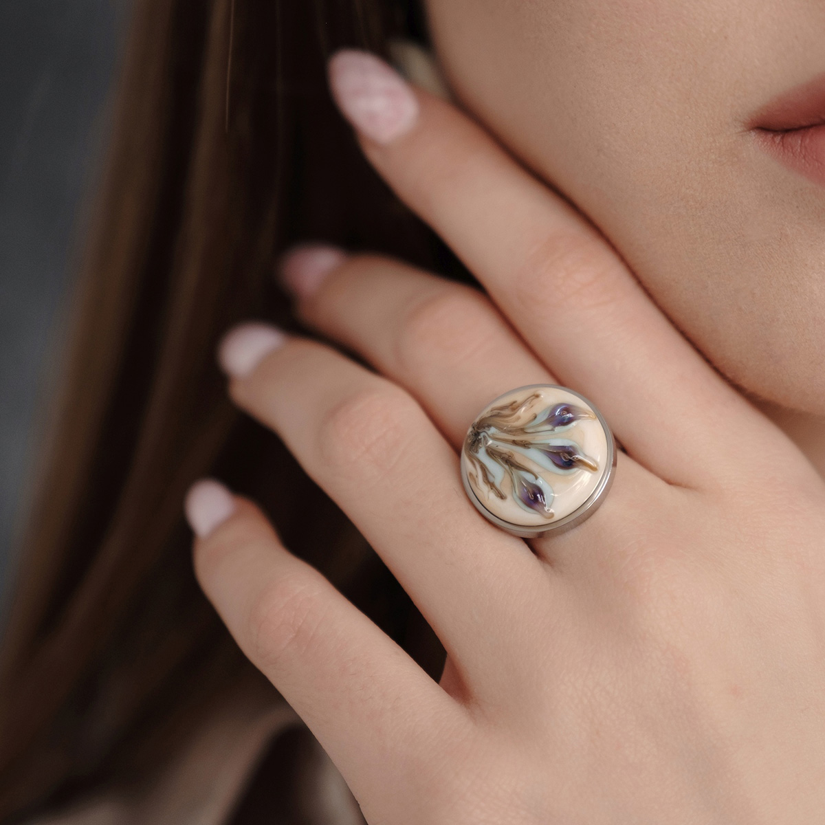 Кольцо изготовлено из муранского стекла и гипоаллергенной ювелирной стали, что очень важно для людей с чувствительной кожей. Металл не темнеет и не подвергается воздействиям окружающей среды, надолго обеспечивая красивый внешний вид изделия. Диаметр стеклянного элемента - 2 см. Кольцо безразмерное, регулируется с 16 до 19 размера. Вес - 8 гр.