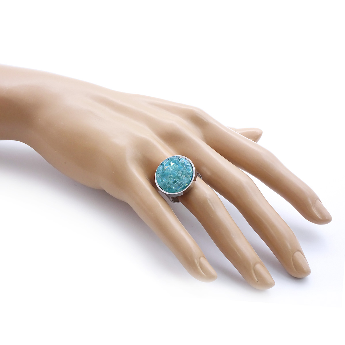 Кольцо изготовлено из муранского стекла и гипоаллергенной ювелирной стали, что очень важно для людей с чувствительной кожей. Металл не темнеет и не подвергается воздействиям окружающей среды, надолго обеспечивая красивый внешний вид изделия. Диаметр стеклянного элемента - 2 см. Кольцо безразмерное, регулируется с 16 до 19 размера. Вес - 8 гр.