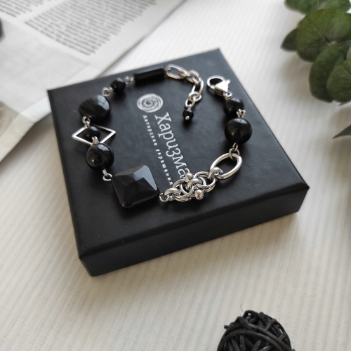 Многослойный браслет из черного агата и оникса в фурнитуре из стали