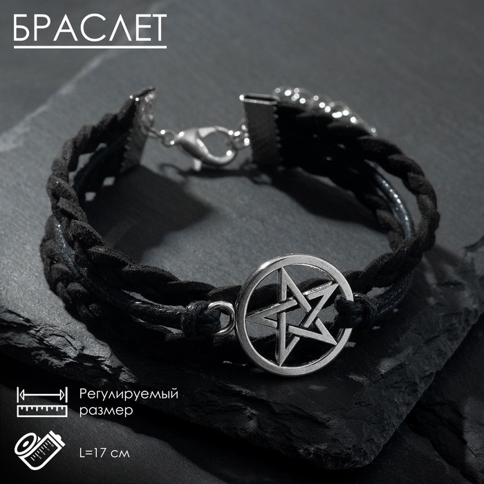 Длина 17 см делает его универсальным аксессуаром для мужчин и женщин, а застёжка-карабин обеспечивает надёжную фиксацию на руке. Вставка из металла с изображением пентаграммы служит мощным талисманом, придающим уверенности и защищённости в любой ситуации. Такой браслет станет не только стильным дополнением к вашему образу, но и символом личной силы и гармонии.