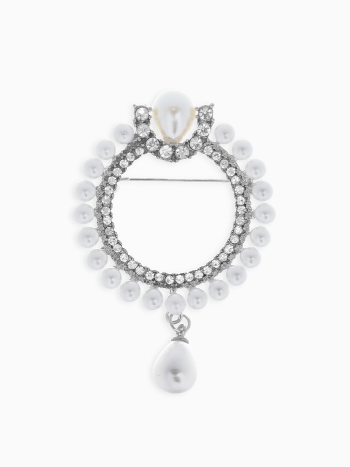 Тонкая грань между классикой и современностью воплощена в этой броши с жемчужным кольцом и подвеской. Белоснежный искусственный жемчуг, сверкающие стразы и серебристая фурнитура создают образ, в котором сочетаются утончённость и лёгкость. Длина изделия — 5,5 см — делает его заметным, но не перегружающим образ, а подвеска добавляет динамики и изящества каждому движению.