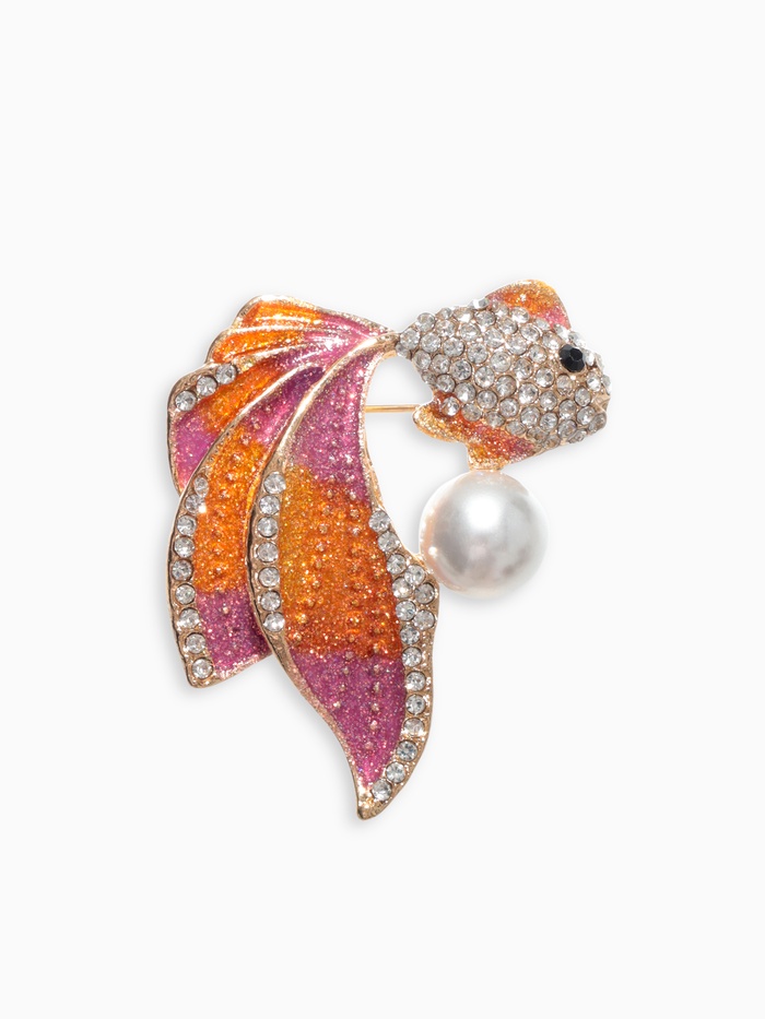 Яркая брошь в форме рыбки с золотистым основанием оживит любой образ, привнеся в него нотки морской свежести и игривого настроения. Мастерски выполненная из металла и украшенная разноцветной эмалью, искусственным жемчугом и сверкающими стразами, она привлекает внимание своей детализированной проработкой и живой палитрой.