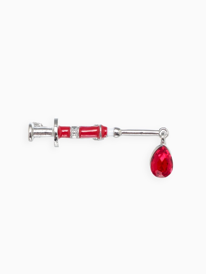 Яркая брошь в форме шприца — это оригинальный аксессуар, который станет прекрасным дополнением образа для всех, кто работает в медицинской сфере. С длиной 4,1 см и красным цветом, она привлекает внимание и подчеркивает профессиональную идентичность владельца, будь то врач, медсестра или медицинский работник.