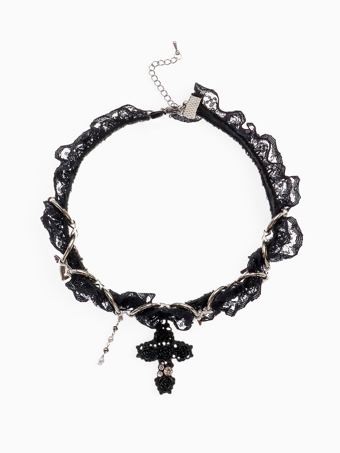 Этот чокер создаёт баланс между минимализмом и выразительностью за счёт простого текстильного ремешка и акцентного крестика. Он подчёркивает линию шеи, добавляя лёгкий готический или рок-штрих в повседневный или праздничный образ.