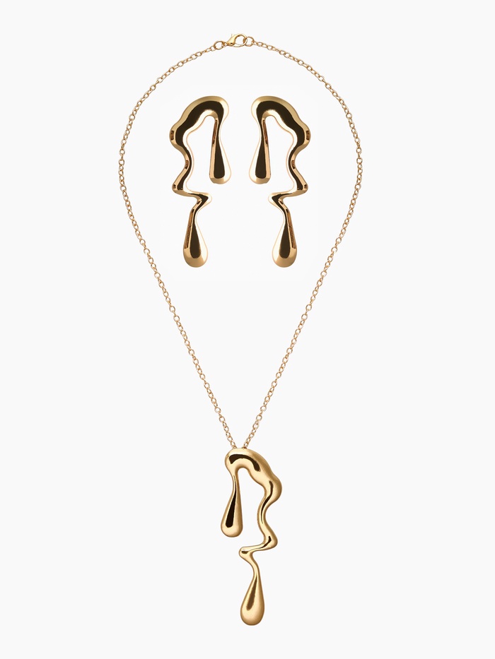 Изящный гарнитур из двух предметов — кулона и серёг — воплощает в себе лёгкость и плавность форм, напоминающих капли, которые медленно тают на солнце. Золотистый оттенок украшений подчёркивает тепло и благородство образа, создавая атмосферу утончённой элегантности и современного стиля.