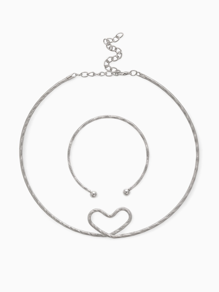 Набор из двух элегантных украшений — чокера и браслета — выполнен в благородном серебристом оттенке, который гармонично впишется в любой образ. Минималистичный дизайн с акцентом на форму сердца без дополнительных вставок подчёркивает современную утончённость и универсальность аксессуаров.