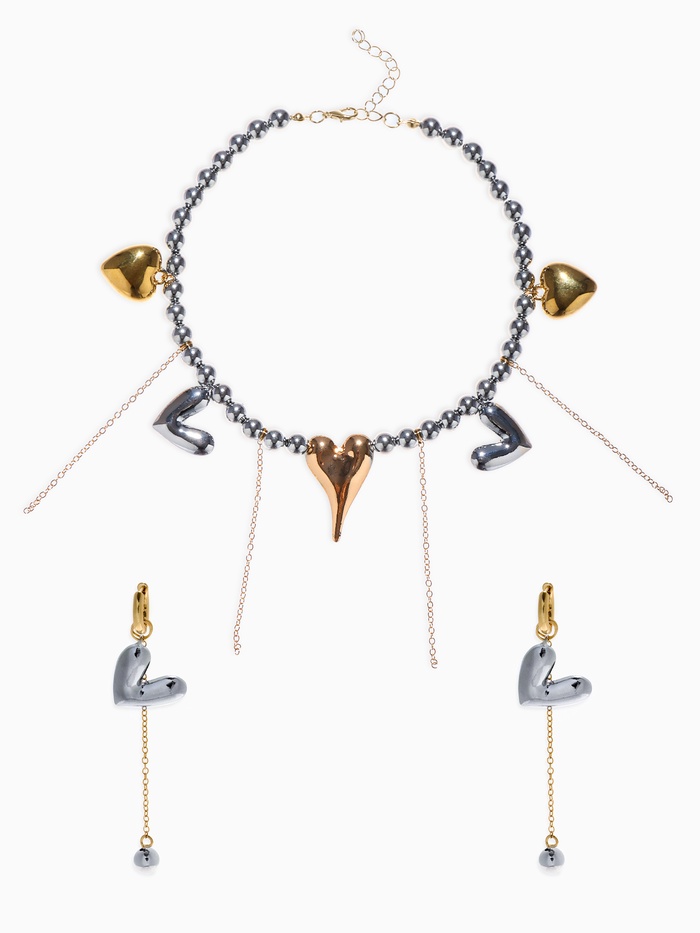 Этот комплект из двух изысканных украшений сочетает в себе романтику и современный стиль, играя благородными золотистыми и серебристыми оттенками. Колье и серьги с темой сердца — символом любви и тепла — позволяют воплотить в повседневном образе трепетные чувства и подчеркнуть индивидуальность.