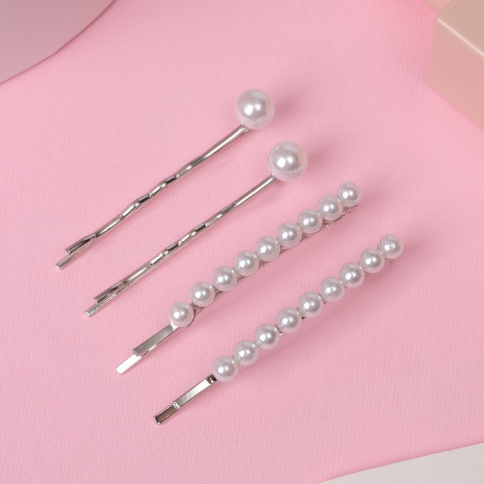 Невидимки для волос «Морская пена», набор 4 шт., бусины, 5 см и 5.5 см, серебристо-белые