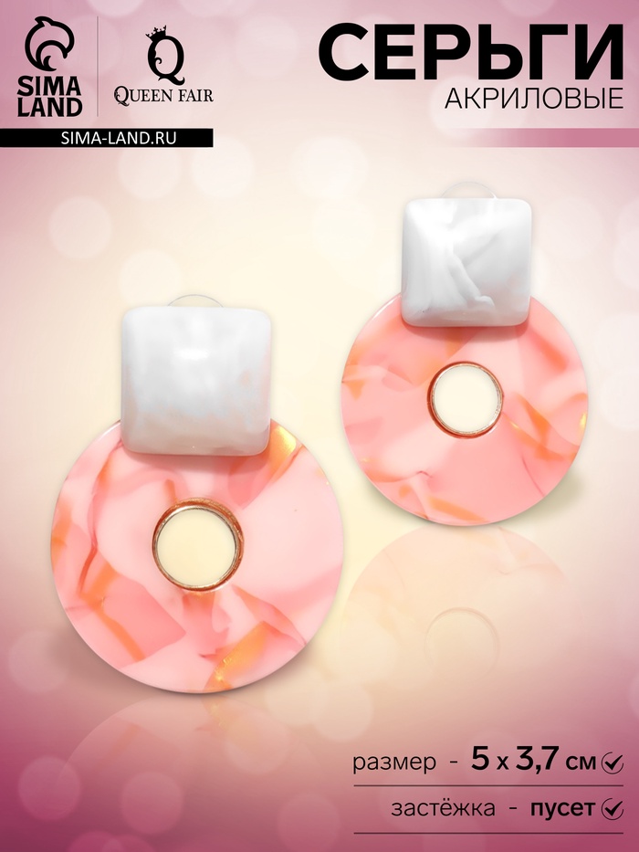 Изысканное сочетание мягких оттенков розового и белого раскрывается в этих серьгах с акриловыми вставками, выполненных на прочной золотистой металлической основе. Геометрический дизайн — круг с квадратом — придаёт украшению современный и стильный вид, который легко впишется в любой образ.
