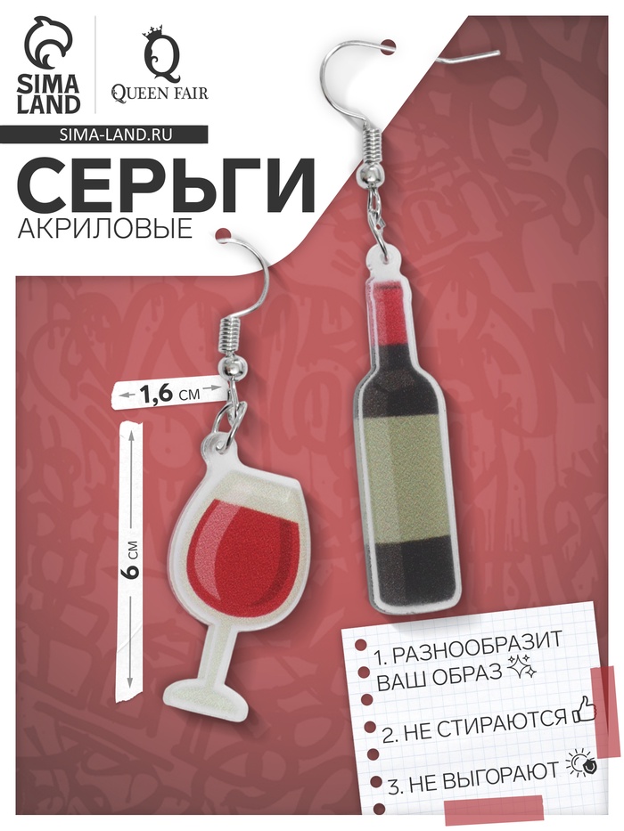 Яркие и выразительные серьги с акриловыми элементами в виде бокала и бутылки вина — отличный способ подчеркнуть настроение и добавить игривый акцент в ваш образ. Их длина 6 см и лёгкая металлическая основа с серебристым покрытием создают гармоничный баланс между стилем и комфортом, а насыщенные красные и чёрные оттенки акрила делают украшение заметным и привлекательным.