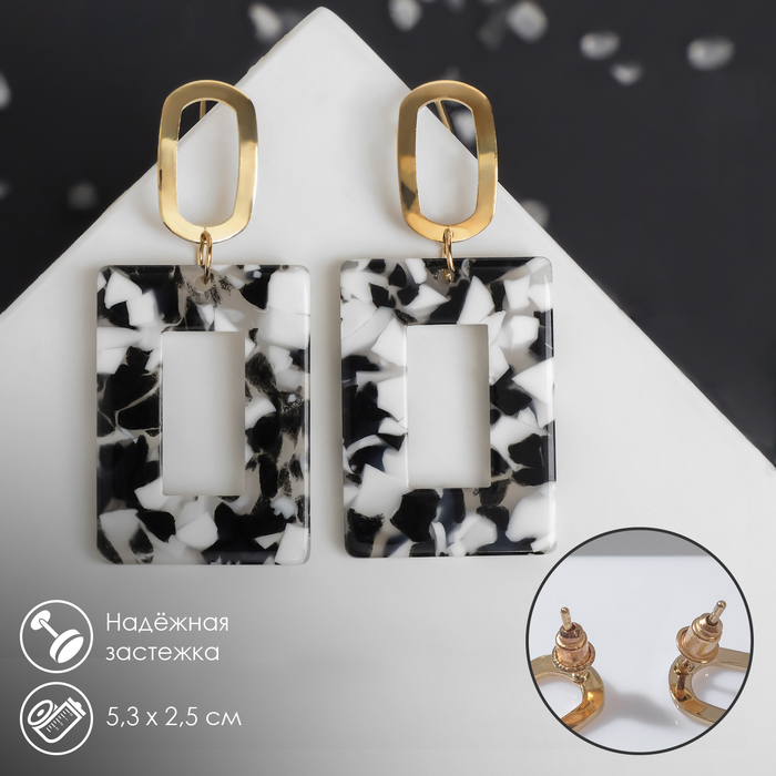 Элегантные прямоугольные серьги с чёрно-белыми вставками и золотистой основой — универсальное украшение для женщин, ценящих современный минимализм и сдержанную цветовую гамму. Длина 5,3 см подчёркивает линию шеи и создаёт аккуратный акцент в образе.