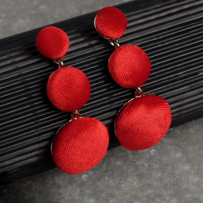 Яркий акцент в образе создают серьги с тремя текстильными дисками насыщенного красного цвета, обрамлённые золотистым металлом. Их длина 5,8 см позволяет эффектно подчеркнуть линию шеи, придавая образу динамичность и современную элегантность.