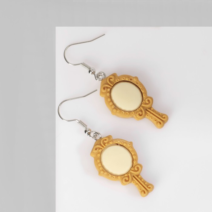 Стильные серьги с нежным бежевым оттенком и оригинальным дизайном в виде зеркал добавят утончённости и лёгкости вашему образу. Изделия длиной 5,5 см выполнены из полимерной глины на прочной металлической основе с серебристым покрытием, что обеспечивает долговечность и комфорт при ношении.