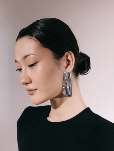 Эти серьги добавляют в образ чёткие линии и серебристое сияние, создавая ощущение лёгкости и современности. Они легко сочетаются с разными стилями одежды, подчёркивая уверенность и вкус.