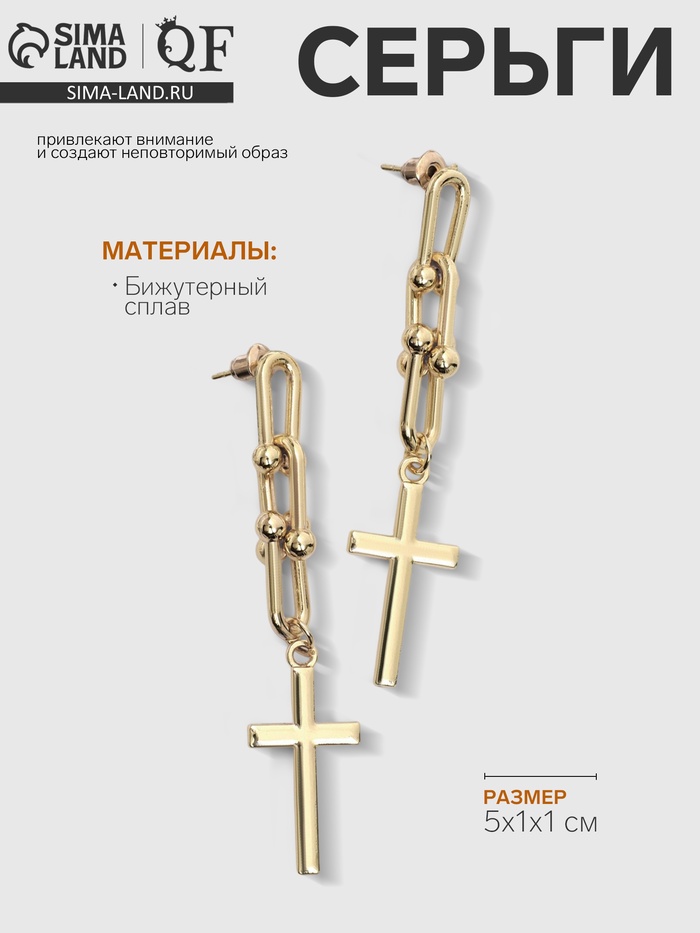 Эти серьги объединяют классический мотив цепи и символ креста, добавляя образу глубину и индивидуальность. Золотистый оттенок придаёт украшению тепло и выразительность, делая его подходящим для повседневного ношения и особых случаев.