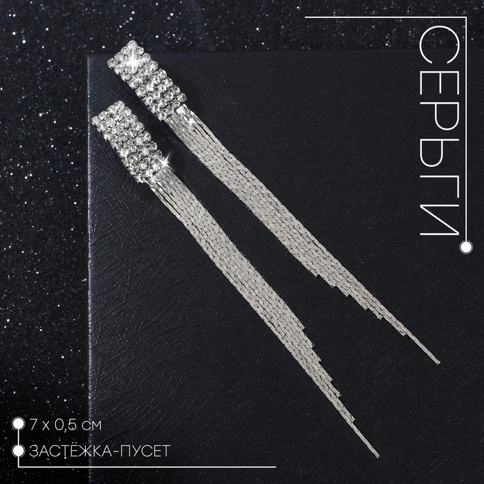 Лёгкие серьги с белыми стразами и серебристой основой длиной 7 см подчеркнут изящество и добавят блеска в любой образ. Прямой ряд кристаллов создаёт эффект чистоты и утончённости, подходящий для особых случаев и повседневного ношения.