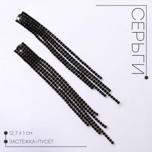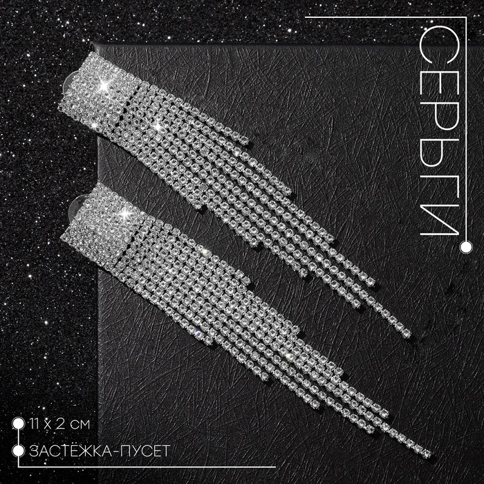Длинные серьги с белыми кристаллами на серебристой основе длиной 11 см создают эффект "водопада", привнося в образ лёгкость и изящество. Геометричный квадратный элемент служит основой для каскада мерцающих страз, подчёркивая утончённость и женственность.