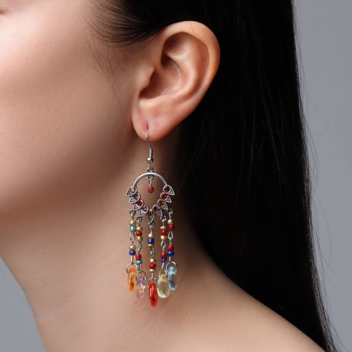 Яркие висячие серьги с цветными стразами на основе из чернёного серебра длиной 8 см станут выразительным дополнением образа для женщин, ценящих восточные мотивы и оригинальный дизайн. Элементы, напоминающие ловец снов, добавляют украшению особую символику и глубину.
