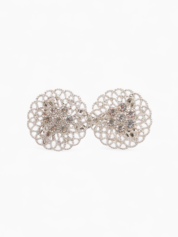 Белый зажим с изящным кружевным узором на серебристом металлическом основании — это гармоничное сочетание утончённости и практичности. Длина 6 см позволяет надёжно фиксировать кардиган или лёгкий шарф, добавляя образу лёгкость и воздушность.