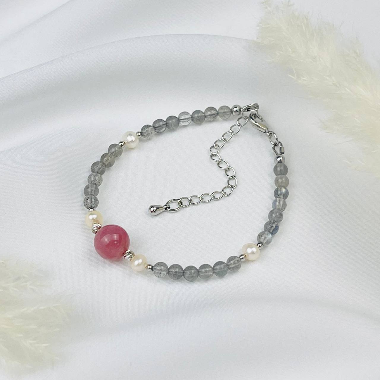 Радуга Самоцветов Браслет из Лабрадора,Жемчуга и мадагаскарского Розового кварца