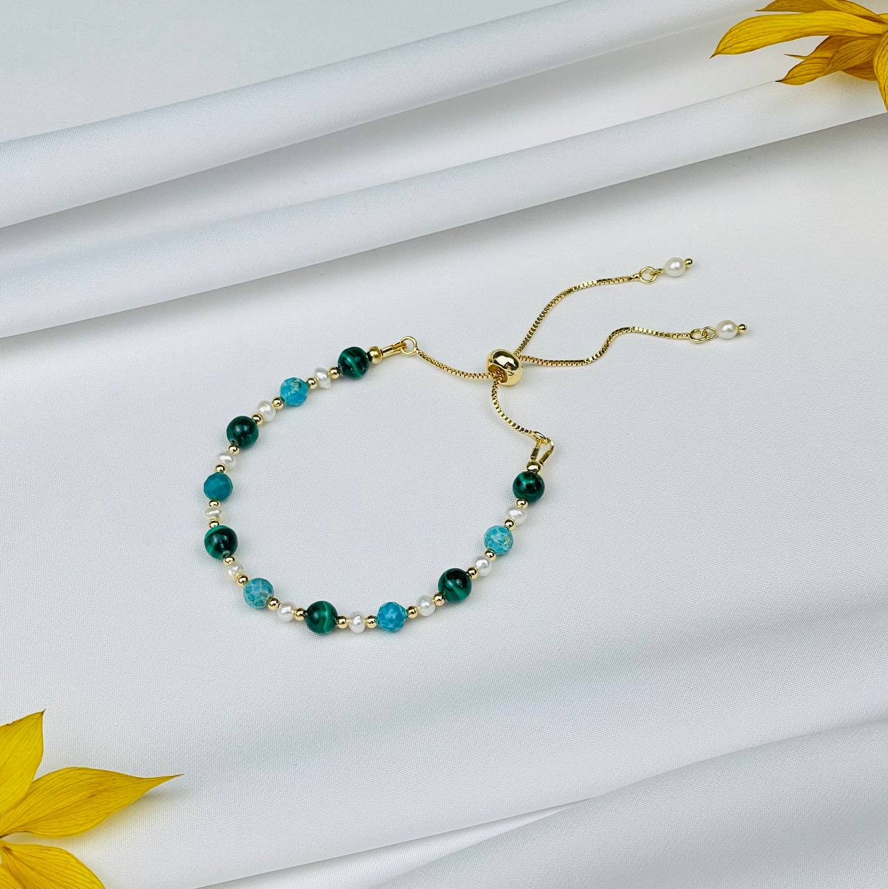 Радуга Самоцветов Браслет регулируемый (на здоровье и долголетие) из Малахита, Бирюзы и Жемчуга