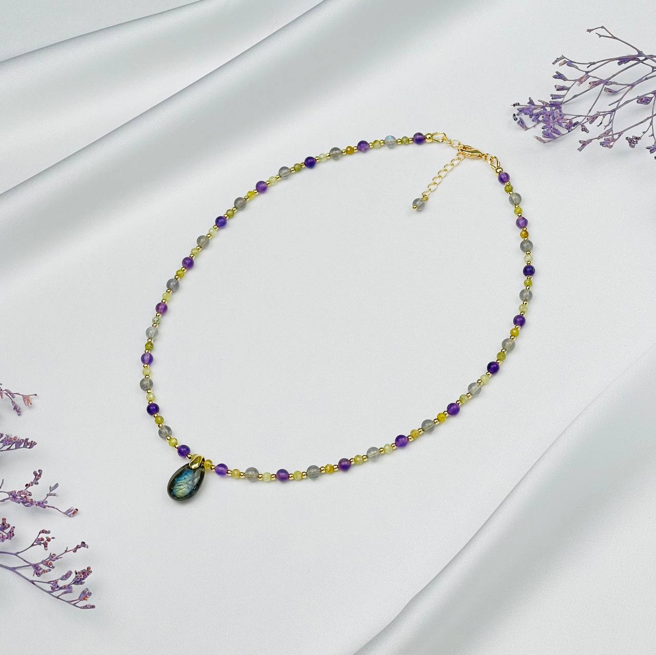 Радуга Самоцветов Колье для "Овна" из Лабрадора, Аметиста и Граната "Гроссуляр"