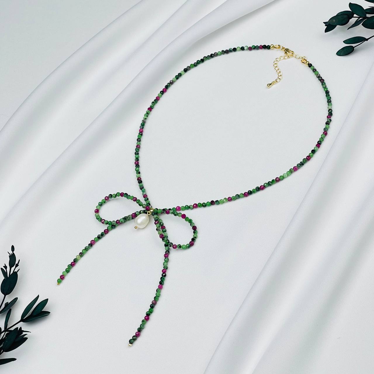 Радуга Самоцветов Колье из Цоизита с Рубином и Жемчуга "Бантик"