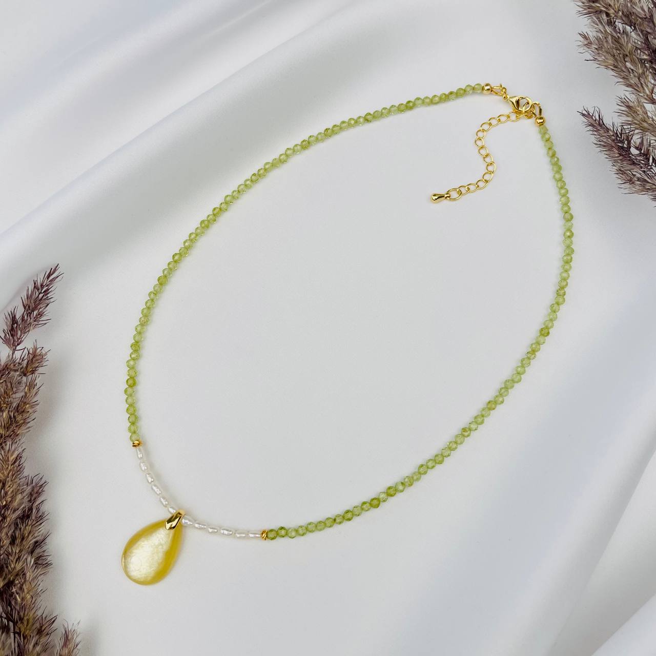 Радуга Самоцветов Колье "Звездная Симфония" из Хризолита и Жемчуга с кулоном из Мусковита