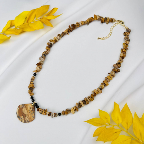 Радуга Самоцветов Колье из песочной Яшмы и Обсидиана с подвеской