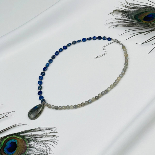 Радуга Самоцветов Колье из Солнечного и Лунного камня с кулоном из Лабрадорра