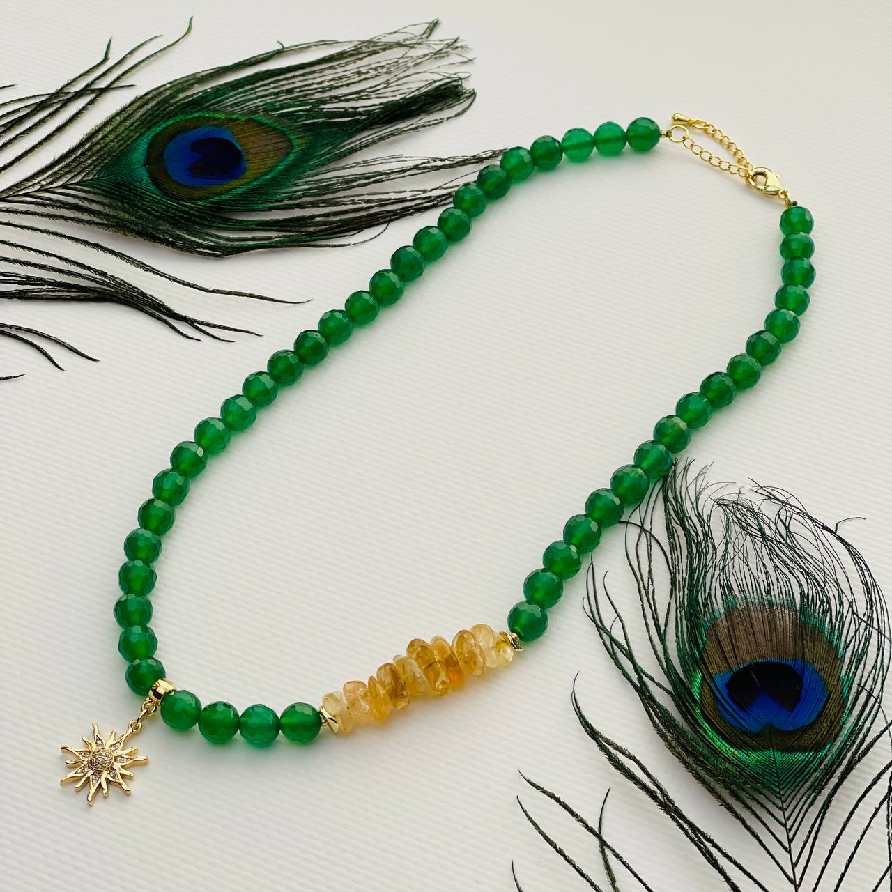 Радуга Самоцветов Колье из зеленого Кварца и Цитрина с подвеской "Солнце"
