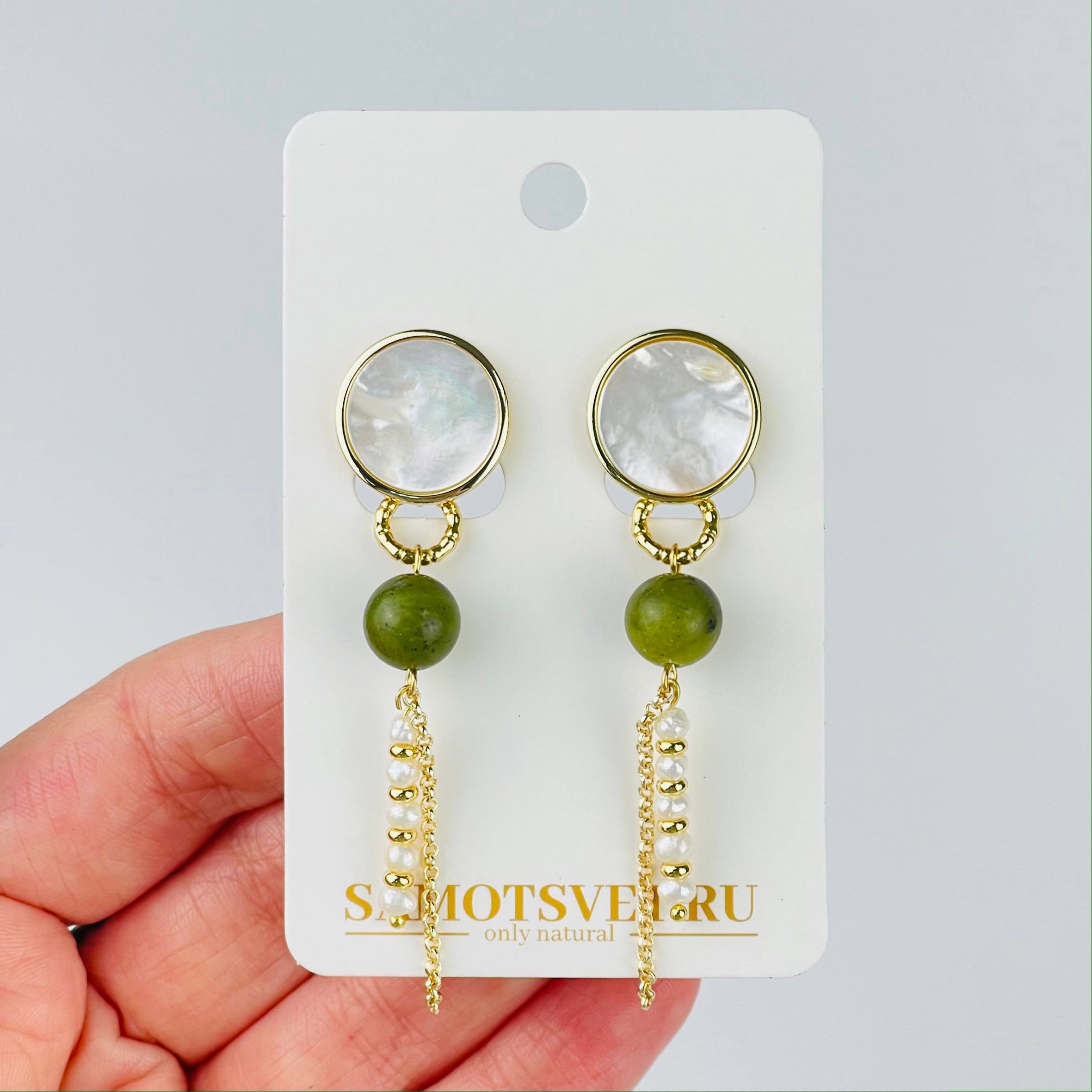 Радуга Самоцветов Серьги длинные из Жемчуга, Змеевика и Перламутра
