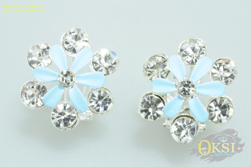 Сережки с бирюзовой эмалью, в форме цветка, украшены сверкающими кристаллами. Размер серьги 1,7 х 1,7 см. Итальянская защелкивающаяся застежка.