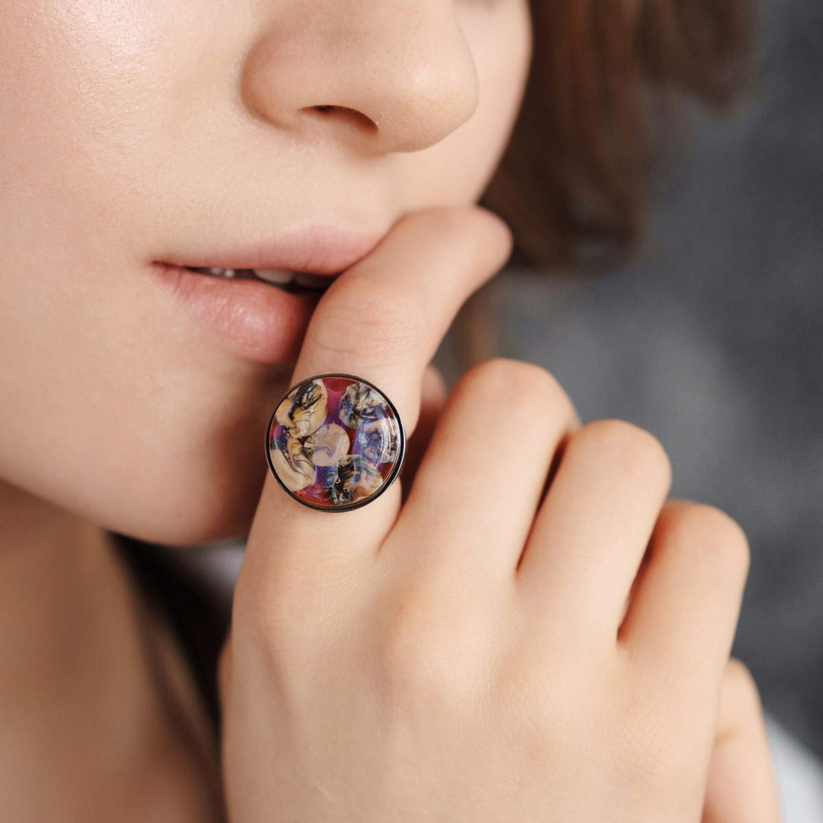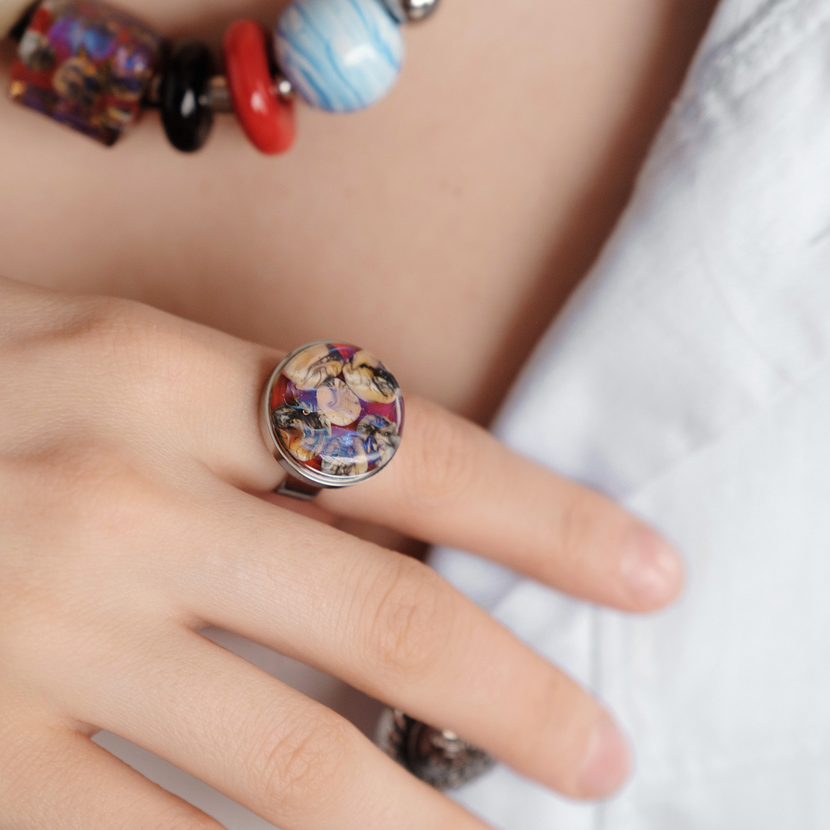 Кольцо изготовлено из муранского стекла и гипоаллергенной ювелирной стали, что очень важно для людей с чувствительной кожей. Металл не темнеет и не подвергается воздействиям окружающей среды, надолго обеспечивая красивый внешний вид изделия. Диаметр стеклянного элемента - 2 см. Кольцо безразмерное, регулируется с 16 до 19 размера. Вес - 8 гр.