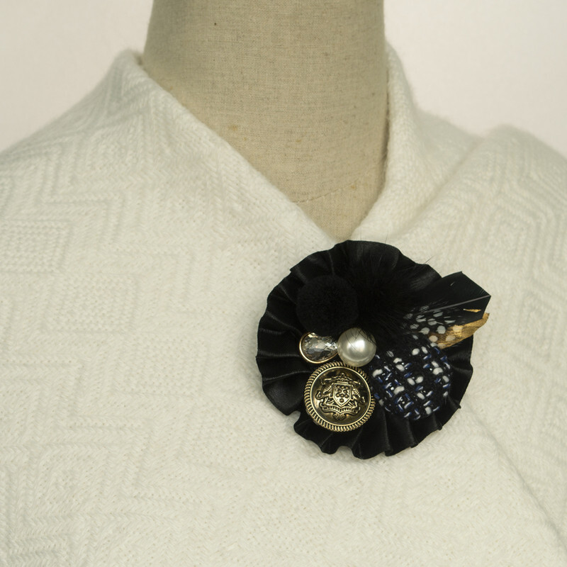Мех норки, перо, текстиль, искусственный жемчуг, хрустальное стекло, латунь. Гальваническое покрытие: золото.