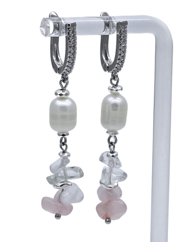 Натуральный жемчуг, розовый кварц, хрусталь, цирконы, ювелирный сплав. Гальваническое покрытие: родий.