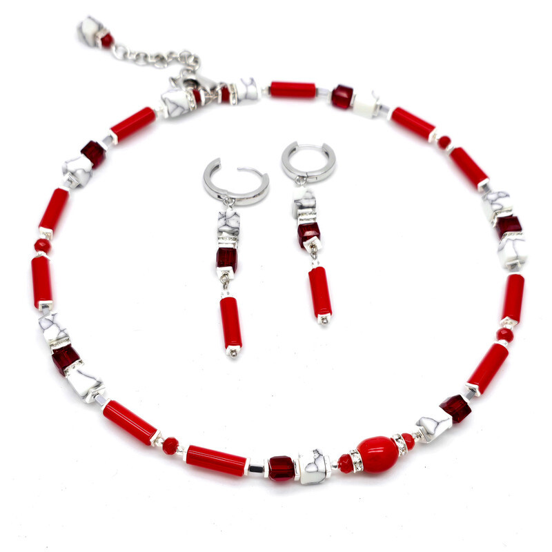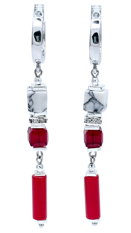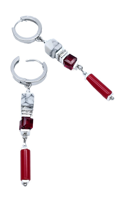 Кахолонг, агат, хрустальное стекло, гематит, кристаллы Preciosa, ювелирный сплав. Гальваническое покрытие: родий.