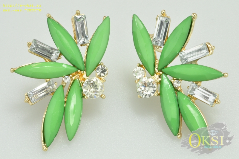 Легкие и стильные, необычной формы и дизайна серьги с синтетическими вставками ярко зеленого оттенка. Длина серьги 3,6 см., ширина 2,2 см. Качественное гальваническое покрытие золотого цвета. Зеленого много не бывает. Особенно, если его оттенки удачно подобраны и идеально сочетаются. Акцентировать внимание на зеленом можно с помощью нейтрального фона. Лучший контраст создает белый и черный. Очень красивые и яркие сочетания с оранжевым и желтым, а также серебряным и золотым цветом одежды и аксессуаров.